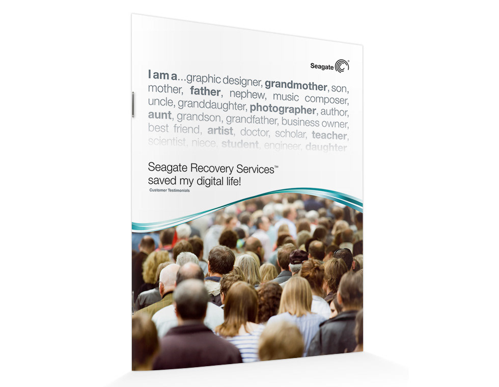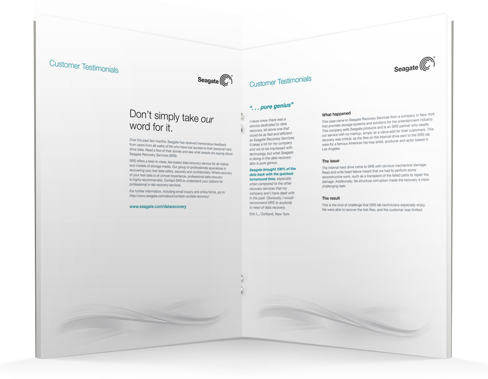 Created an eight page brochure for Seagate Recovery Services that highlighted multiple customer testimonials regarding how "Seagate Recovery Services saved my digital life!"